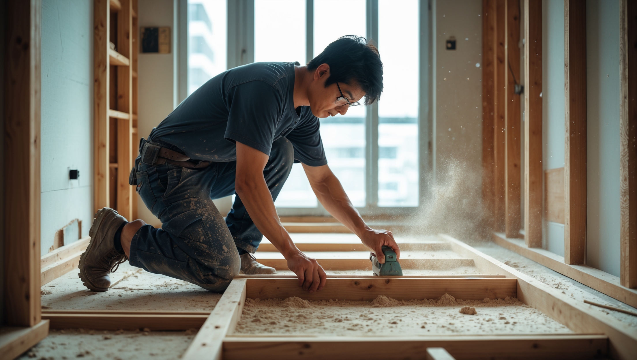2. ゲストハウス新築工事、置床・乾式二重床、ダミー合板、捨て貼り、フローリング根太張り工事