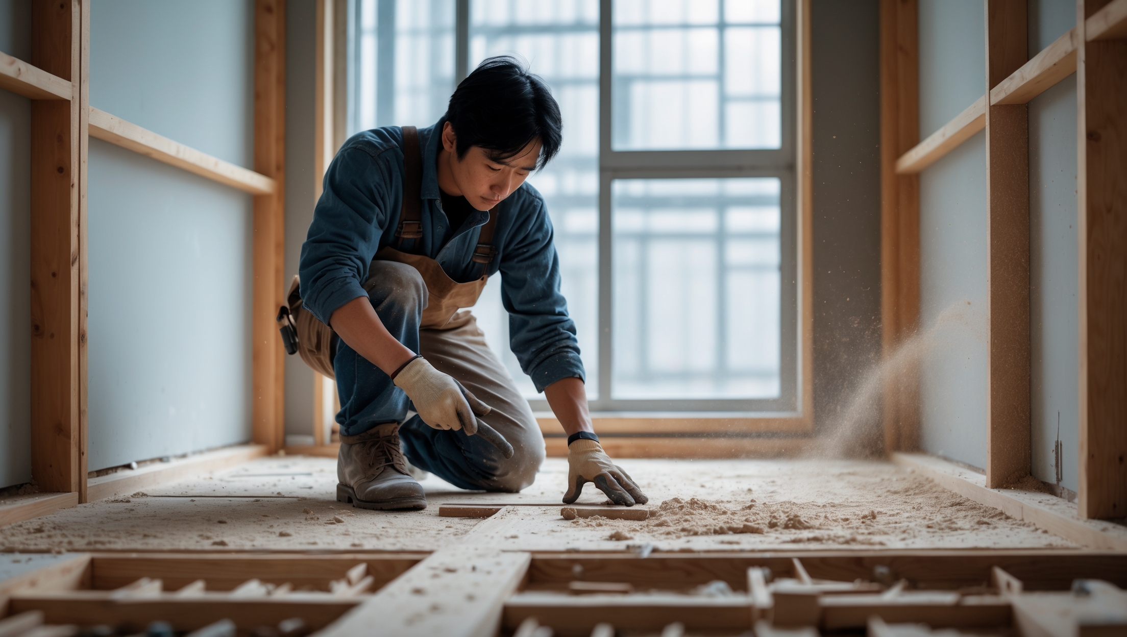 2. ゲストハウス新築工事、置床・乾式二重床、ダミー合板、捨て貼り、フローリング根太張り工事