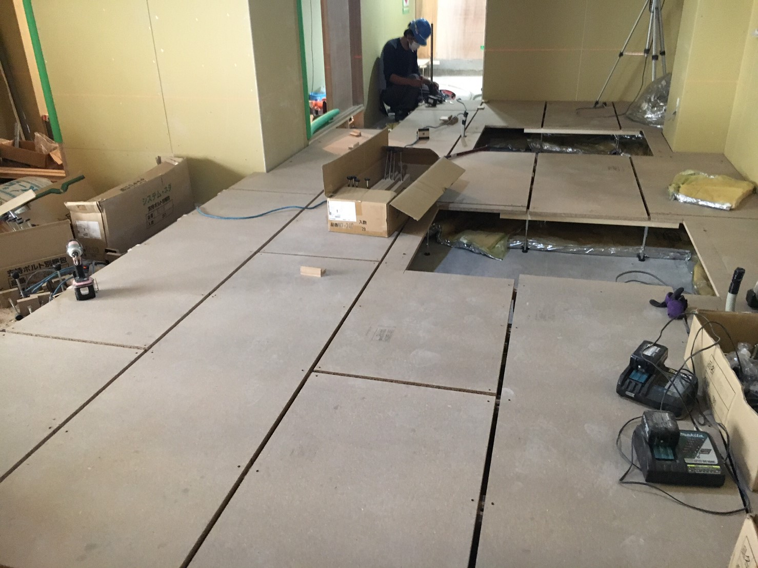 2. ゲストハウス新築工事、置床・乾式二重床、ダミー合板、捨て貼り、フローリング根太張り工事