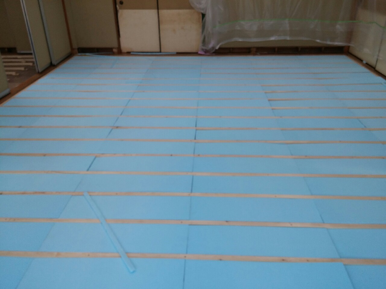 2. ゲストハウス新築工事、置床・乾式二重床、ダミー合板、捨て貼り、フローリング根太張り工事