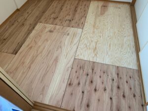 2. ゲストハウス新築工事、置床・乾式二重床、ダミー合板、捨て貼り、フローリング根太張り工事