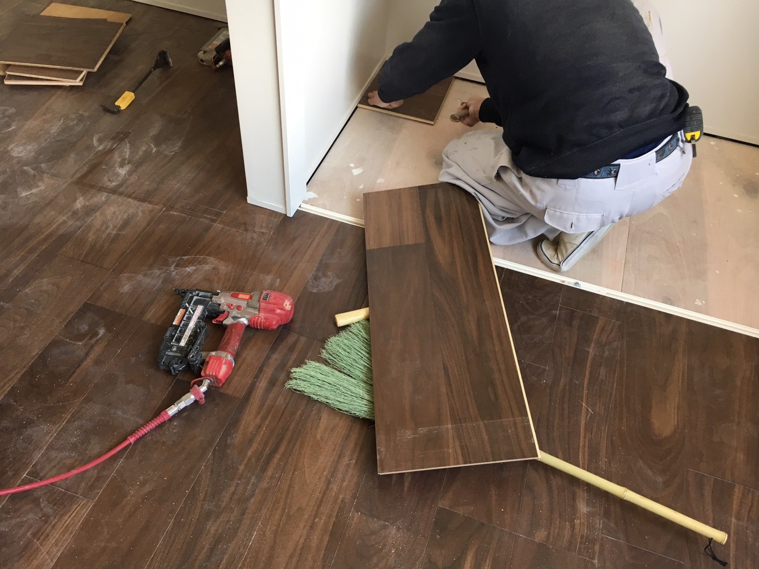 2. ゲストハウス新築工事、置床・乾式二重床、ダミー合板、捨て貼り、フローリング根太張り工事