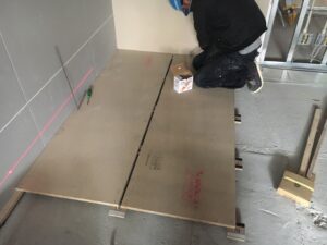 2. ゲストハウス新築工事、置床・乾式二重床、ダミー合板、捨て貼り、フローリング根太張り工事