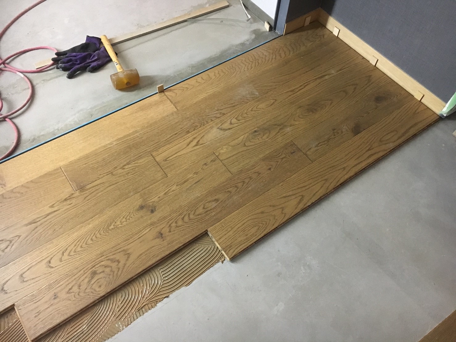 2. ゲストハウス新築工事、置床・乾式二重床、ダミー合板、捨て貼り、フローリング根太張り工事