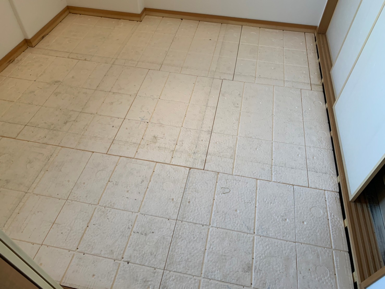 2. ゲストハウス新築工事、置床・乾式二重床、ダミー合板、捨て貼り、フローリング根太張り工事