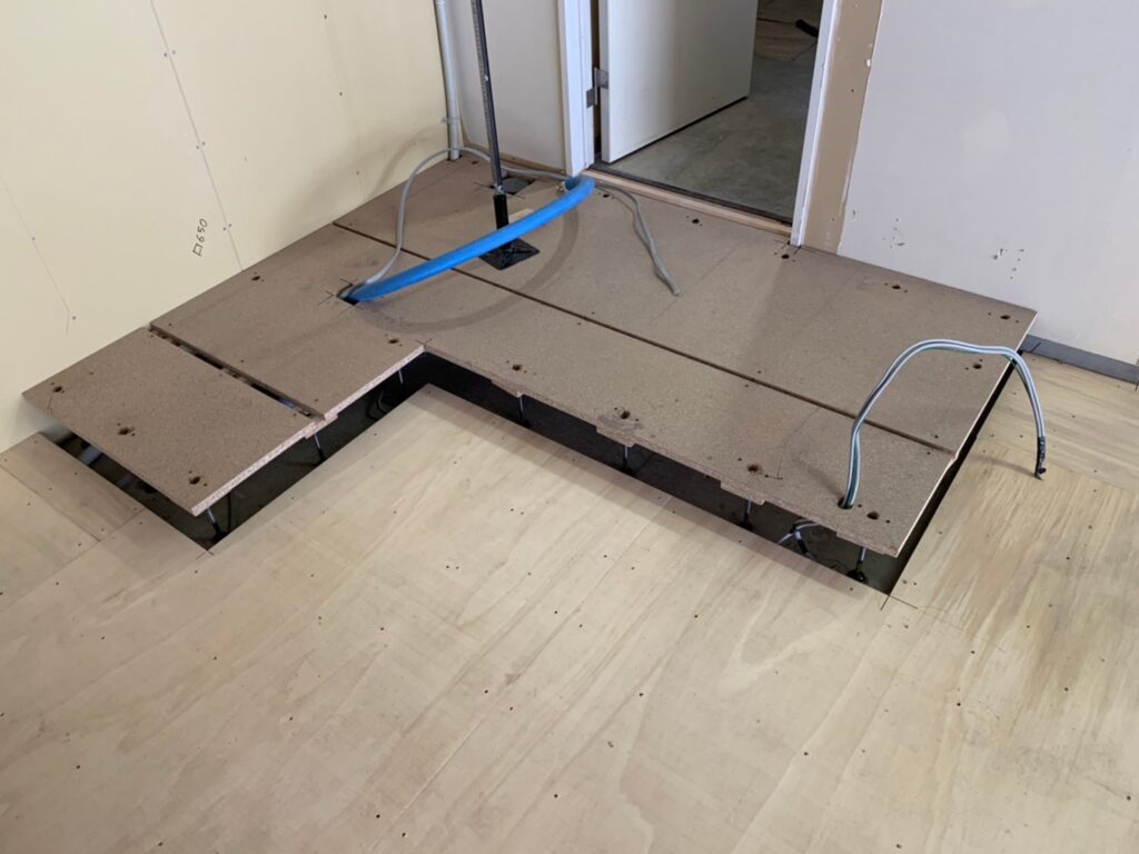 置き床工法では、支持脚と床パネルの組み合わせがクッション性を生み、程よい弾力が得られます。