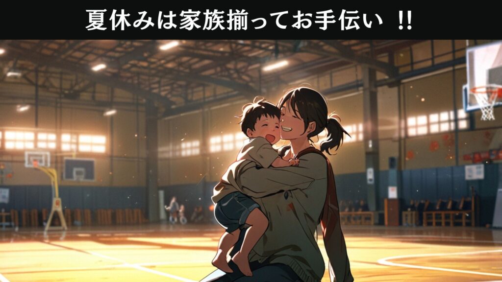 夏休みは家族総出で体育館の床工事のお手伝い。