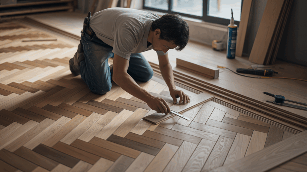 ヘリンボーン張りは、一般的なフローリング張りとは異なり、角度の正確さや木目の方向性など繊細な職人技が求められるため、専門的な施工経験のある会社に依頼することが重要です。